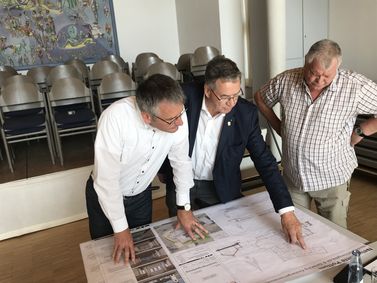 Bei seinem Termin vor Ort in Pottum erläuterten Ortsbürgermeister Klaus Weil und der Projektleiter und 1. Beigeordnete Edelbert Schilling dem heimischen Landtagsabgeordneten Hendrik Hering die Pläne zur Umgestaltung des Gemeindezentrums und der Kirche.