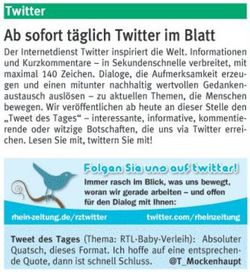Premiere bei der Rhein-Zeitung: Der durch die Indiskretionen bei der Bundespräsidentenwahl einer breiten Masse bekannt gewordene "Twitter-Dienst" wird schon länger durch die Zeitung genutzt um mit den Leserinnen und Lesern im ständigen Dialog zu sein. Jetzt hat sich die Zeitung eine neue Rubrik einfallen lassen und veröffentlicht das "Gezwitscher des Tages" zu einem aktuellen Thema.