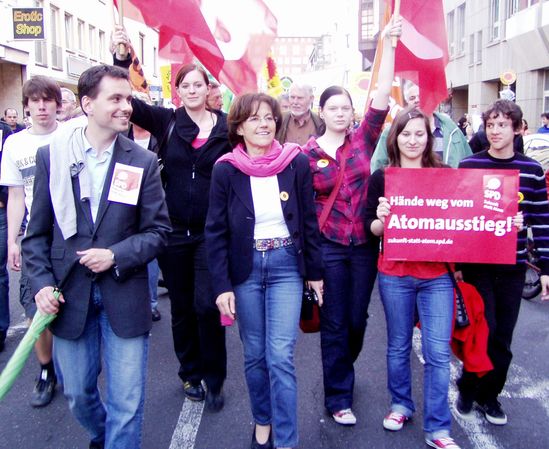 Auf der gestrigen Anti-Atom-Demo in Koblenz waren Westerwälder Jusos und Sozialdemokraten zwar nicht die größte aber anscheinend die auffälligste Truppe. Das hatte zur Folge, dass sich der SPD-Landtagsabgeordnete David Langner und die Staatsministerin für Umwelt, Forsten und Verbraucherschutz, Margit Conrad, auf dem Demonstrationszug zu uns gesellten.